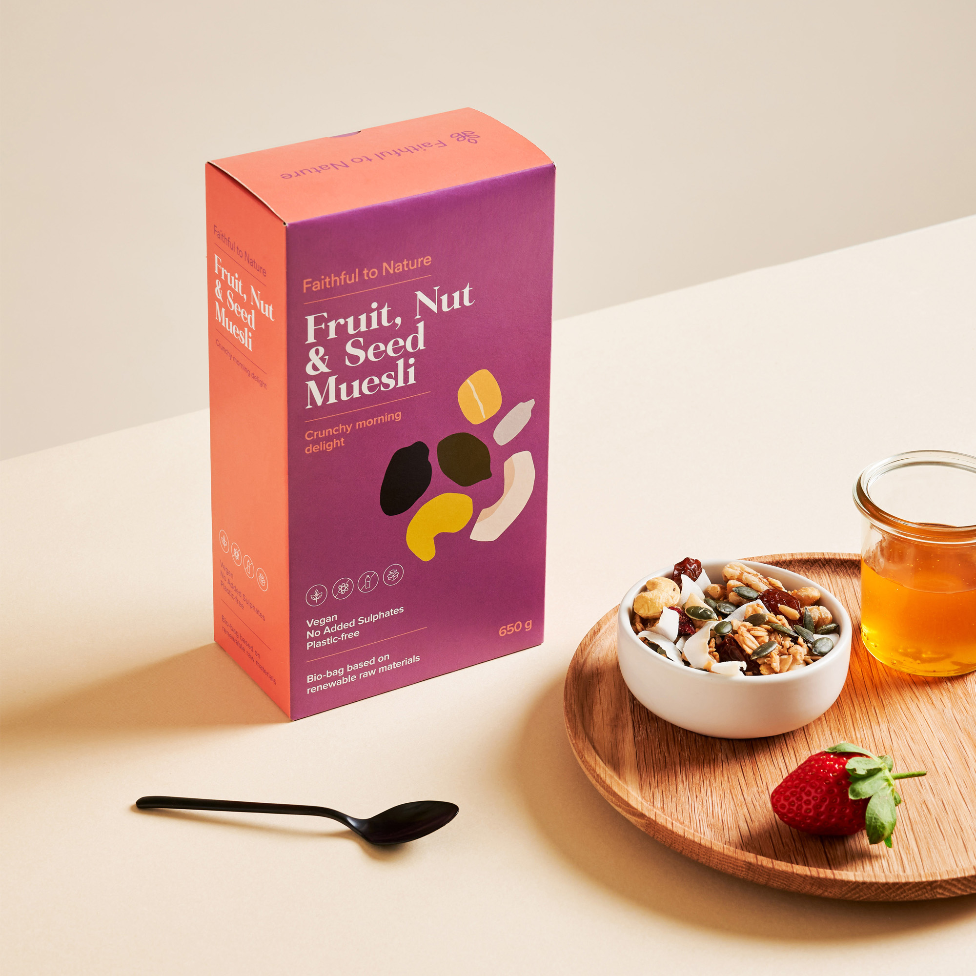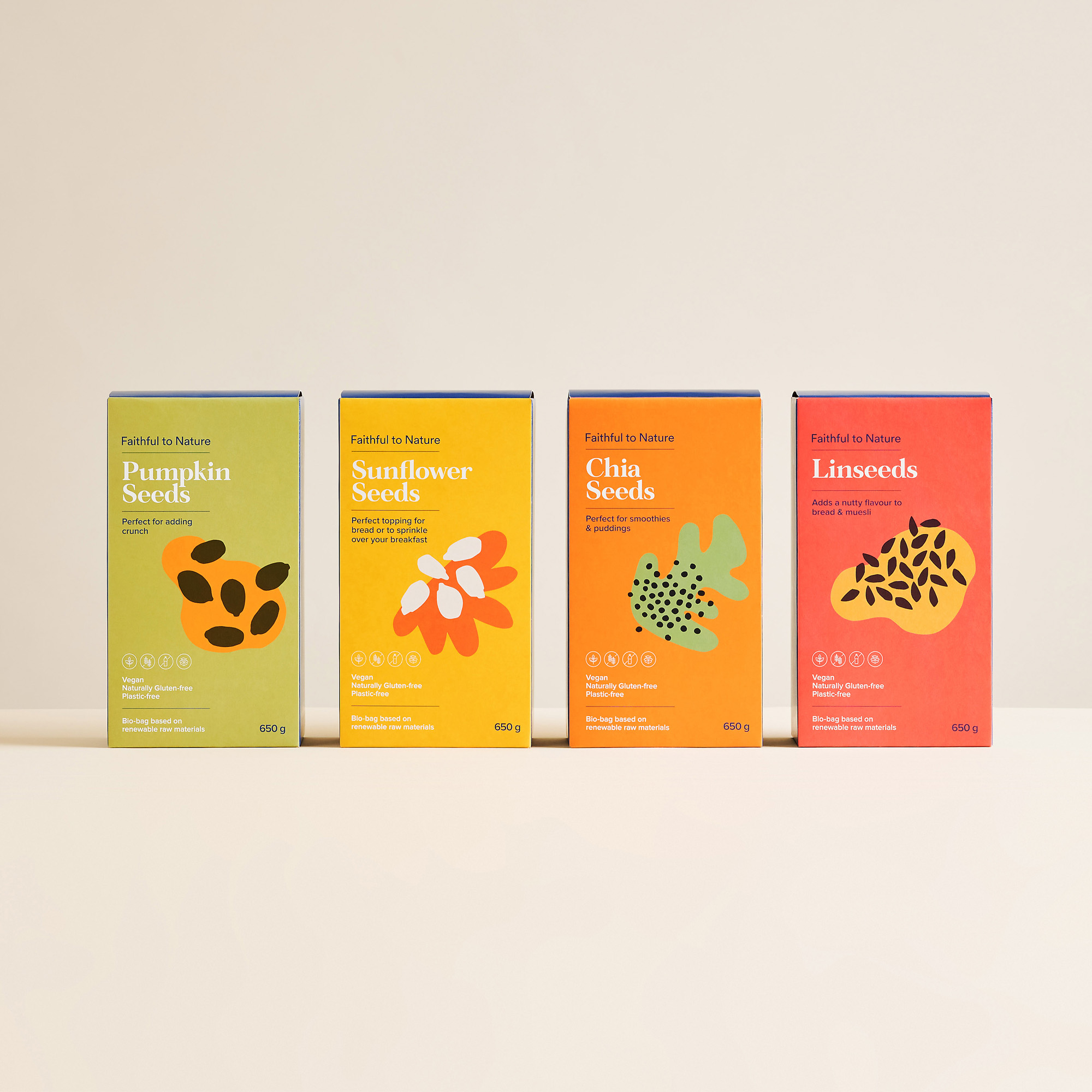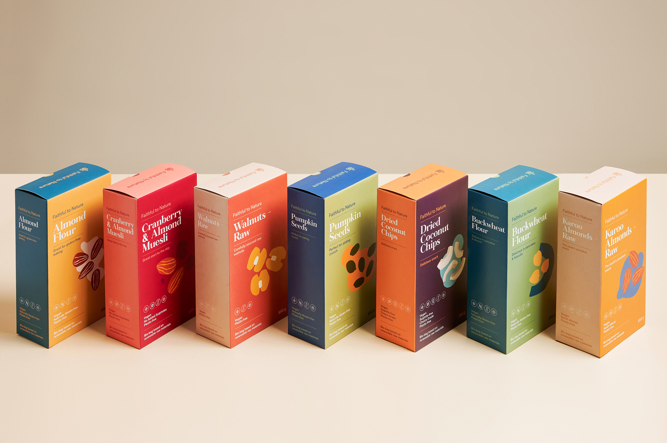 共同的元素,如標(biāo)志設(shè)計定位,字體和標(biāo)題層次仍然貫穿于所有產(chǎn)品,以創(chuàng)造一致性,跨越所有范圍,并喚起品牌認(rèn)知度。包裝設(shè)計忠實于大自然的標(biāo)志性無廢料包裝,有環(huán)境之心。儲藏室的貨物都是用植物纖維素制成的袋子,F(xiàn)SC認(rèn)證的盒子里印著植物用的墨水.所有忠實的自然紙箱是100%堆肥。