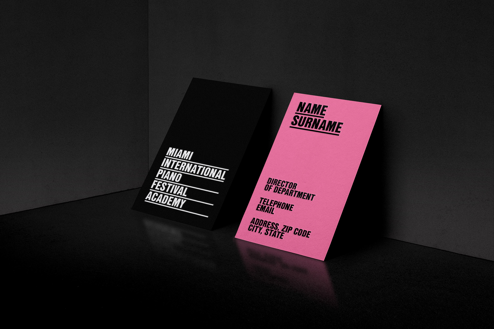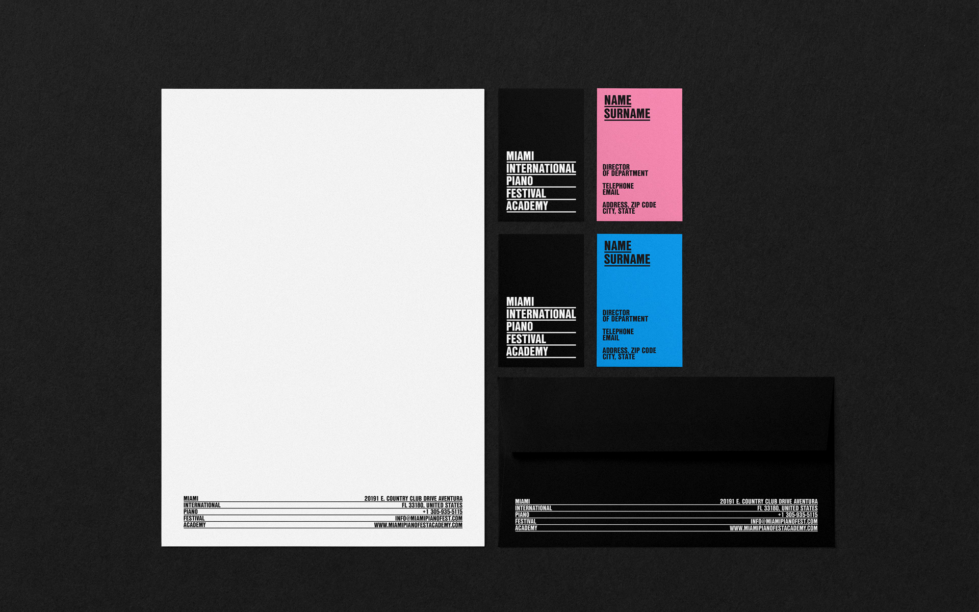 我們使用了典型的音樂元素,五線譜,來強(qiáng)調(diào)品牌形象設(shè)計名稱的每個單詞。這些線條沿著圖形元素使用,幫助我們創(chuàng)建網(wǎng)格。調(diào)色板向邁阿密的標(biāo)志性藝術(shù)建筑致敬。