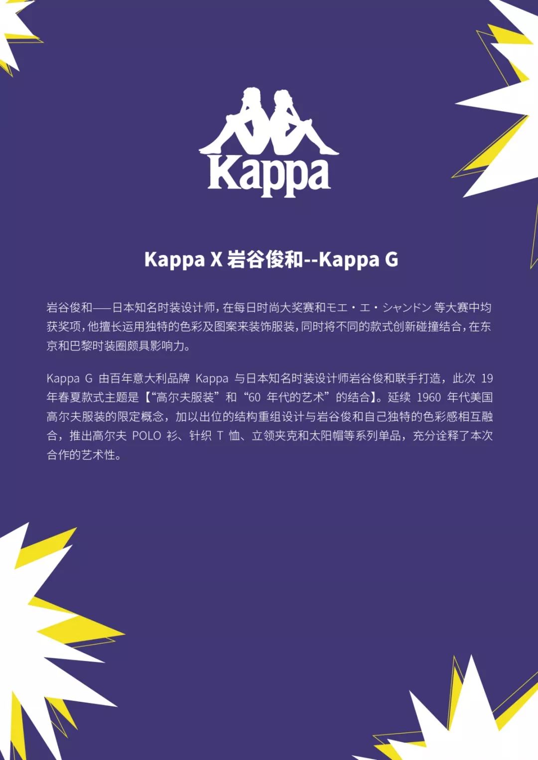 品牌寓意:Kappa 所予人的第一印象是年輕、活力、熱情、時(shí)尚、酷愛(ài)運(yùn)動(dòng)。